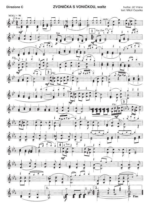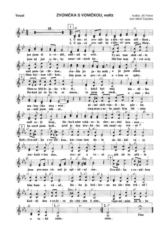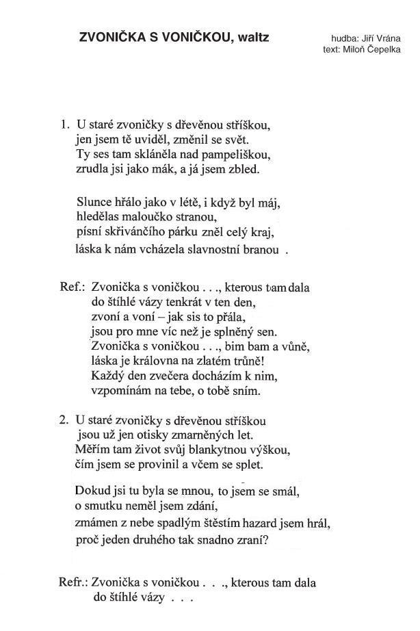 Zvonička s voničkou1. U staré zvoničky s dřevěnou stříškou, jen jsem tě uviděl, změnil se svět. Ty ses tam skláněla nad pampeliškou, zrudla jsi jako mák a já jsem zbled. Slunce hřálo jako v létě,i když byl máj, hledělas maloučko stranou, písní skřivančího párku zněl celý kraj, láska k nám vcházela slavnostní branou. 2. U staré zvoničky s dřevěnou stříškou, jsou už jen otisky zmarněných let, Měřím tam život svůj blankytnou výškou, čím jsem se provinil a v čem sae splet. Dokud jsi tu byla se mnou, to jsem se smál, o smutku neměl jsem zdání, zmámen z nebe spadlým štěstím hazard jsem hrál, proč jeden druhého tak snadno zraní? R: Zvonička s voničkou, kterous tam dala do štíhlé vázy tenkrát v ten den, zvoní a voní, jak sis to přála jsou pro mne víc než je splněný sen. Zvonička s voničkou bim bam a vůně, láska je královna na zlatém trůně. Každý den z večera docházím k nim, vzpomínám na tebe o tobě sním. Text zaslal: karel-Jevišovice |