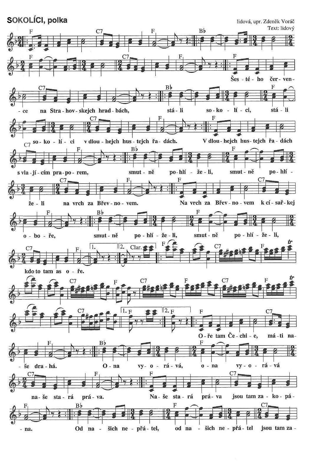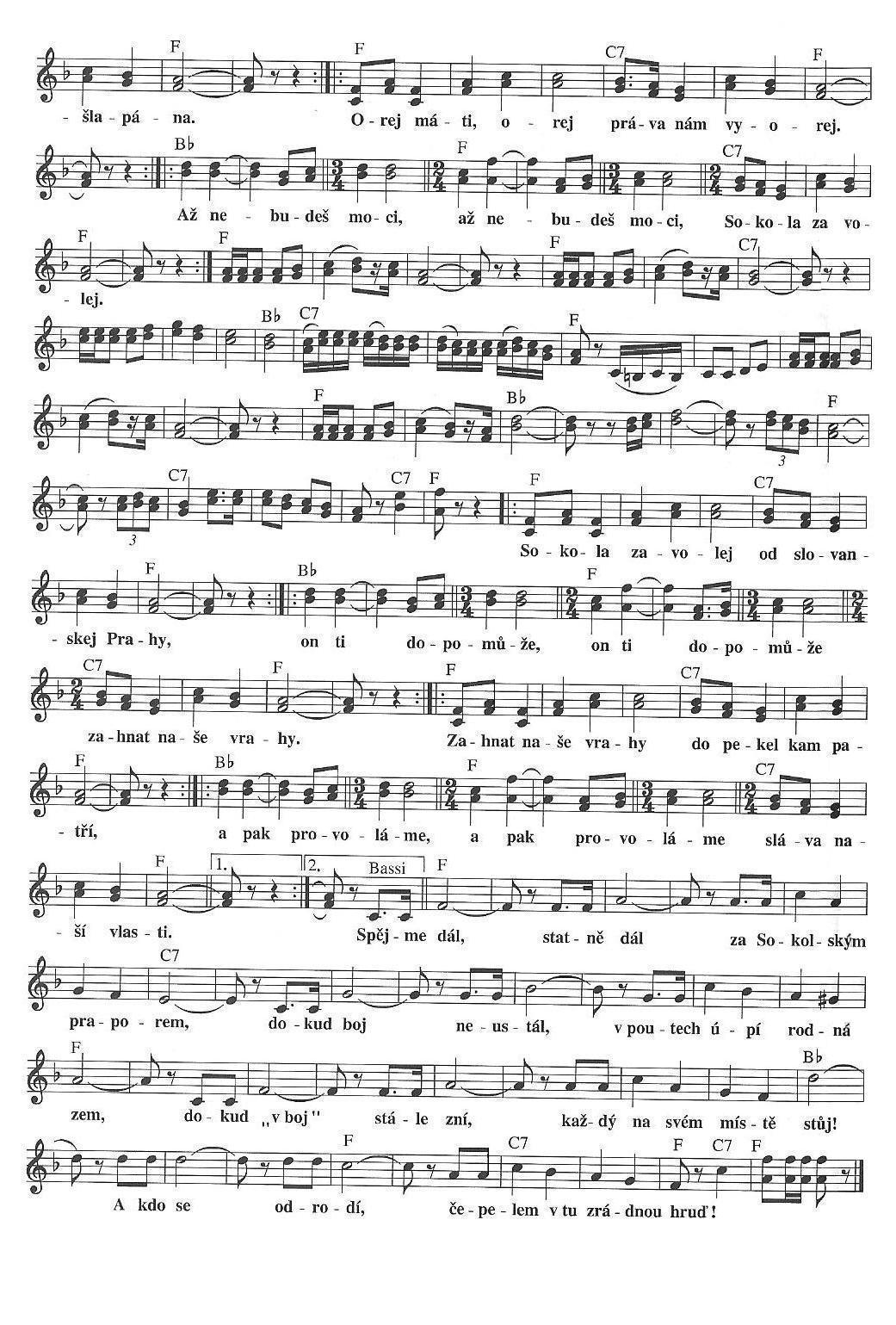 SokolíciŠestého července na strahovských hradbách stáli sokolíci, stáli sokolíci v dlouhejch, hustejch řadách. V dlouhejch, hustejch řadách s vlajícím praporem. Smutně pohlíželi, smutně pohlíželi na vrch za Břevnovem. Na vrch za Břevnovem, směrem k Bílé hoře. Smutně pohlíželi, smutně pohlíželi kdopak to tam oře. Oře tam Čehyně, máti naše drahá. Ta nám vyorává, ta nám vyorává naše stará práva. Naše stará práva jsou tam zašlapaná. Od našich nepřátel, od našich nepřátel jsou tam zašlapaná. Orej máti, orej, práva nám vyorej. Až nebudeš moci, až nebudeš moci sokola zavolej. Sokola zavolej z té slovanské Prahy. On ti dopomůže, on ti dopomůže vyhnat naše vrahy. Vyhnat naše vrahy do pekel kam patří. A pak zazpívejme a pak zazpívejme sláva, nazdar bratři. Text zaslal: slavakol |