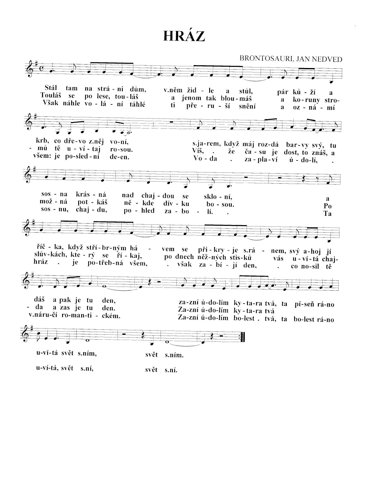 | dalsi harmonicky gulas serveru HH | tentokrat si chyby uz hledejte sami midismudlove.. ale bude to mit tezsi protoze pisen neni na youtube.. tam najdete jen par blbecku kteri hraji G Hm Em jak to kdysi nejaky hudebni analfabet zapsal do not.. zajimavejsi je text ve kterem nemaji jasno ani brontosauri.. v poslednim radku tichotova zpiva svet s ni (vztahuje se k pisni a bolesti) coz je logictejsoi nez svet s nim (vztahuje se k ranu) | |