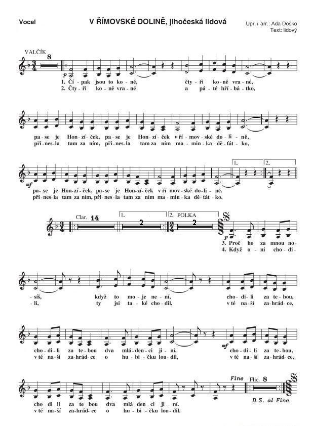 V římovské dolině1. Čípak jsou to koně, čtyři koně vrané pase je Honzíček, pase je Honzíček v římovské dolině pase je Honzíček, pase je Honzíček v římovské dolině. 2. Čtyři koně vrané,a páté hříbátko, přinesla tam za ním,přinesla tam za ním maminka děťátko přinesla tam za ním, přinesla tam za ním maminka děťátko mezihra potom tempo polka Proč ho za mnou nosíš,když to moje není, chodili za tebou, chodili za tebou dva mládenci jiní chodili za tebou, chodili za tebou dva mládenci jiní Když oni chodili, ty jsi také chodil, v té naší zahrádce, v té naši zahrádce o hubičku loudil v té naší zahrádce, v té naší zahrádce, o hubičku loudil. Text zaslal: karel-Jevišovice |