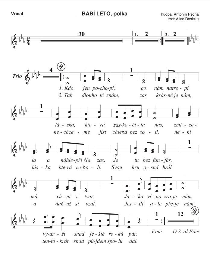 Babí létoORCHESTR 64 taktu VCHOD 4 takty Kdo jen pochopí, co nám natropí láska, která zaskocila nás, zmizela, a náhle prisla zas. Je tu bez fanfár, má vuni i tvar, jako víno zraje nám, vydrzí snad jeste roku pár. Tak dlouho te znám, tak krásne je nám. Nechceme jíst chleba bez soli, není lásky, která nebolí. Tvou hru osud hrál, a tak uz jsi stár. Jestli ale preje nám, tentokrát tak pujdem spolu dál. MEZIHRA 12 taktu Tak dlouho te znám, tak krásne je nám. Nechceme jíst chleba bez soli, není láska, která nebolí. Tvou hru osud hrál, a tak uz jsi stár. Jestli ale preje nám, tentokrát tak pujdem spolu dál. Text zaslal: Koci |