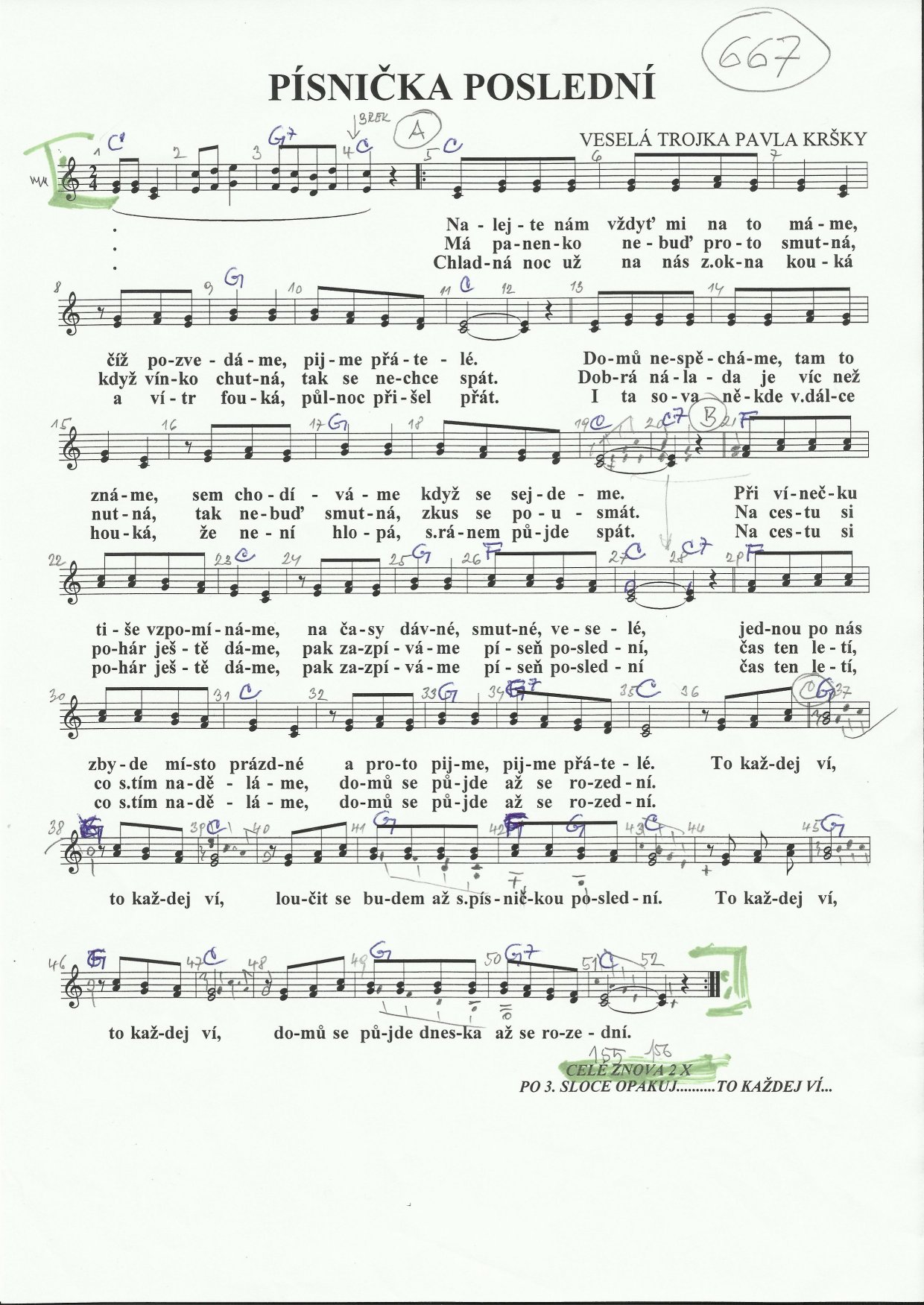Písnička posledníNalejte nám, vždyť my na to máme, číž pozvedáme, pijme přátele, domů nespěcháme, tam to známe, sem chodíváme když se sejdeme. Při vínečku tiše vzpomínáme, na časy dávné, smutné, vesele, jednou po nás zbyde místo prázdné a proto pijme, pijme přátele. To každej ví, to každej ví, loučit se budem až s písničkou poslední. To každej ví, to každej ví, domů se půjde dneska až se rozední. Má panenko nebuď proto smutná, když vínko chutná, tak se nechce spát. Dobrá nálada je víc než nutná, tak nebuď smutná, zkus se pousmát. Na cestu si pohár ještě dáme, pak zazpíváme píseň poslední, čas ten letí, co s tím naděláme, domů se půjde až se rozední. To každej ví, to každej ví, loučit se budem až s písničkou poslední. To každej ví, to každej ví, domů se půjde dneska až se rozední. Chladná noc už na nás z okna kouká a vítr fouká, půlnoc přišel přát. I ta sova někde v dálce houká, ze není hloupá, s ránem půjde spát. Na cestu si pohár ještě dáme, pak zazpíváme píseň poslední, čas ten letí, co s tím naděláme, domů se půjde až se rozední. To každej ví, to každej ví, loučit se budem až s písničkou poslední. To každej ví, to každej ví, domů se půjde dneska až se rozední. Text zaslal: Honza |